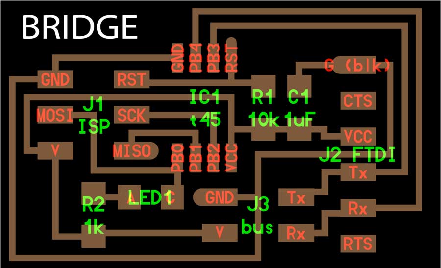 The milling machine were collapsed on thursday in my lab so I could only manage to mill the bridge and had to wait for the day after so I decided to pair with my colleage < a href="http://archive.fabacademy.org/archives/2017/fablabbcn/students/51/">Trinidad Gomez who was in the same situation but had managed to mill her 2 nodes and not her bridge. At least we did not get stock and later once the lab calms down we could mill our own boards.