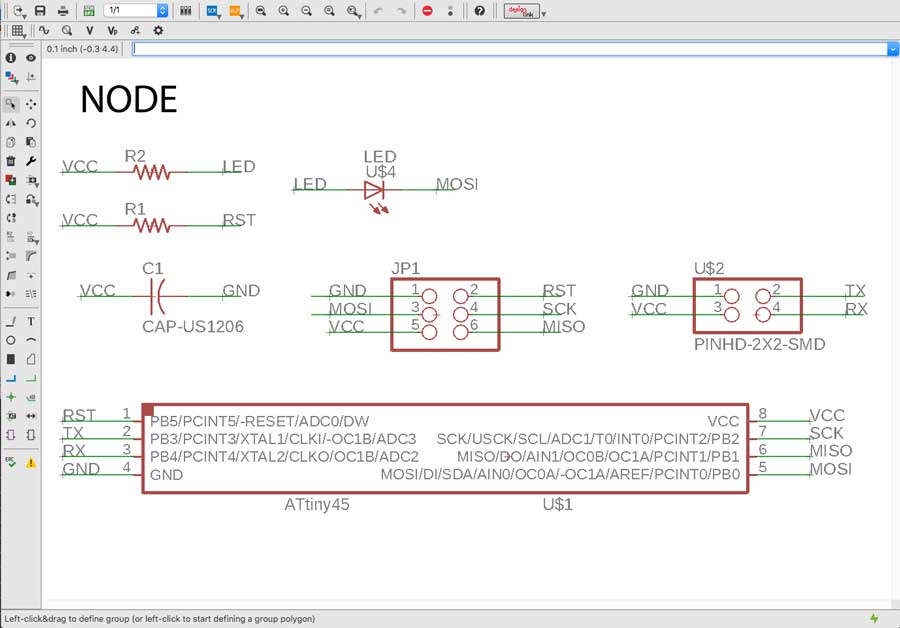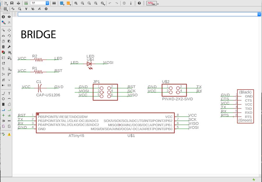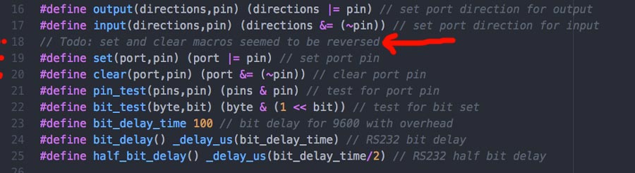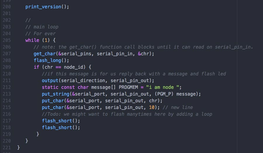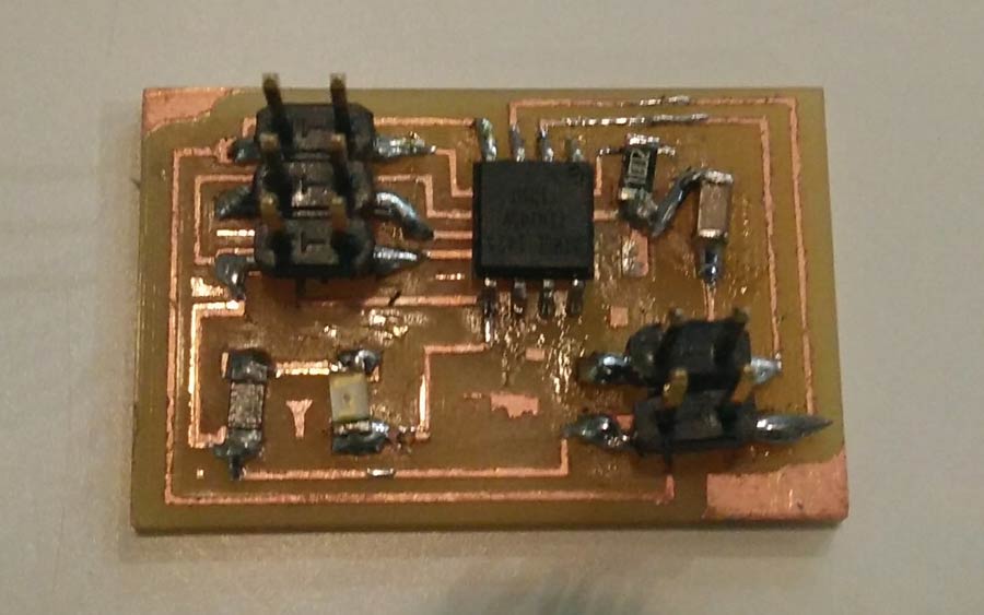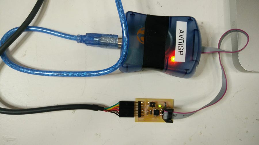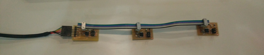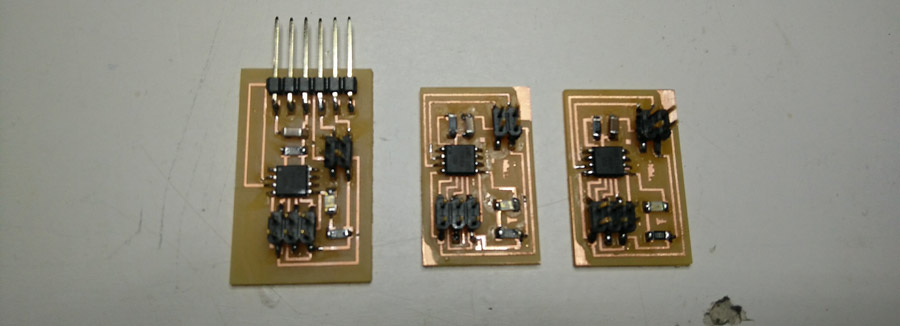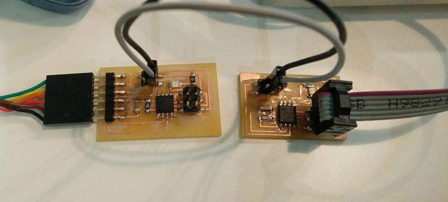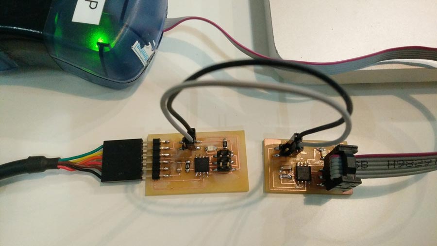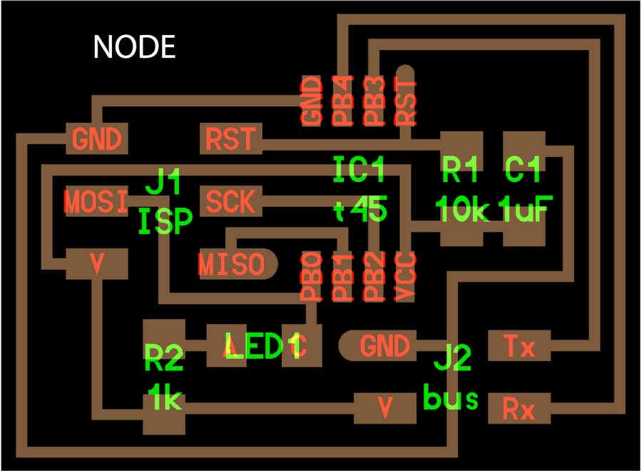 Milling and soldering is usual business by now. I lost lots of time troubleshooting the nodes and that took time that I had planned to invest into the programming part. Anyhow there is something that I found strange and I looked into it. During the .c and python workshop we had a few weeks ago, our instructors emphasized the fact that in serial communication the TX and RX pins are always crossed between 2 connected nodes. But the boards (bridge and nodes) are serial bus and connects TX with RX in a linear way (not crossed). I researched and figured that this crossing do not necessarly have to happen through hardware. It can be programmed in software. Analysing Neil's .C code I identified the lines that makes this function.