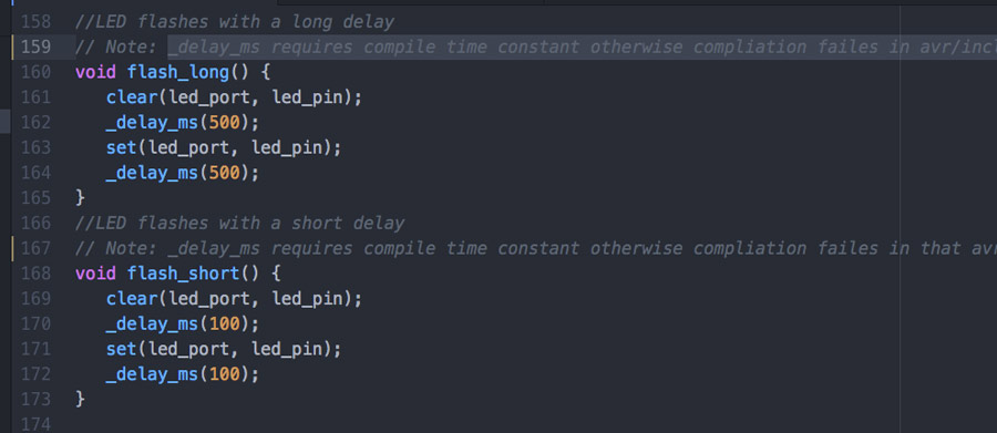 Note: We tried to add a variable as a flash argument but could not compile. _delay_ms requires compile time constant otherwise compliation failes in avr/include/util/delay.h. We opted to just create the function and repeat it which is what we wanted to by-pass.