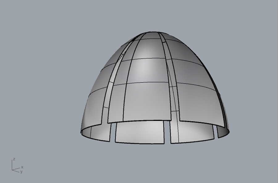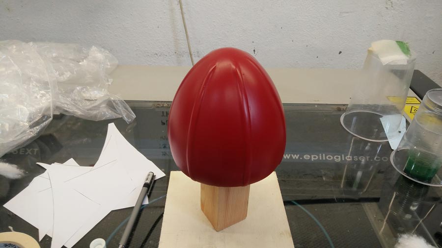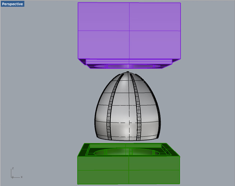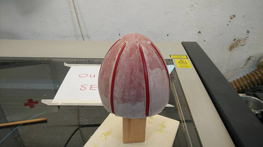 I went back to the Rino file I used to create the egg shape in concrete. And I tried to extract the shape and project it on a flat surface so I can later cut it in thin layer of paper while avoiding seams. It is a very complex operation because the mold contains double curvature. I investigated and consulted with colleages experts in Rhino and was advised to use "smash" and "squish" command. I struggled a lot but never could extract an accurate flat surface that would marry perfectly with the 3D mold. My conclusion is that it is not possible to generate the flat surface without seams - at least not in Rhino.
