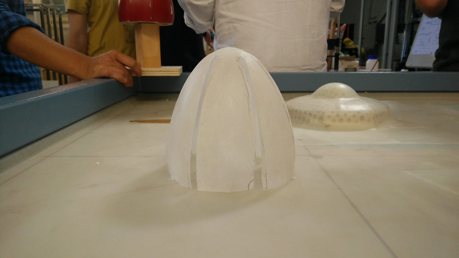 I lacquered the mold to make the surface poreless, spreaded vaseline on the mold and placed the 5 layers of Japanese paper cut outs on the mold, layer by layer and applying potassium silicate on each of them until the paper is soaked. Even though it is practically impossible to avoid folds in the paper in the areas of sharp curvature, to get the best result it is important to start from the middle of the object and push the paper towards the edge - in this case of each section. This way the excedent of paper is located on the extrusion which I plan to cut afterwards.