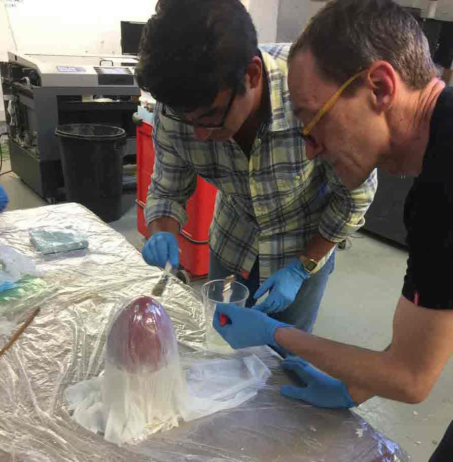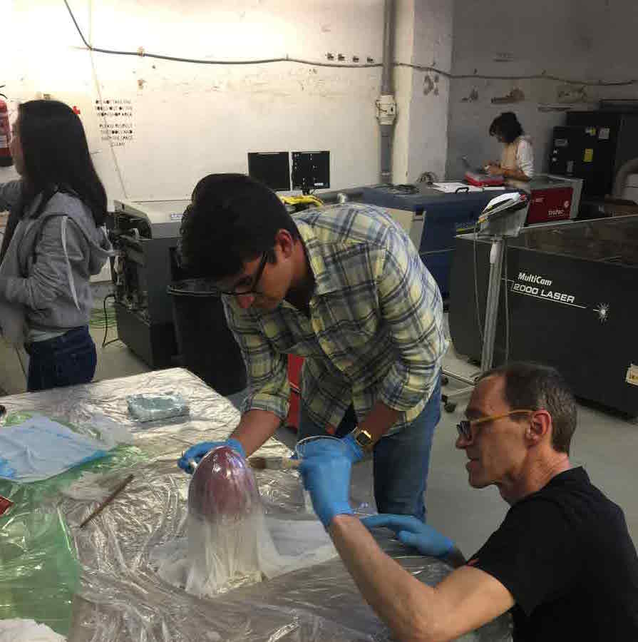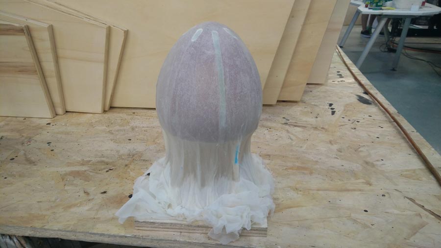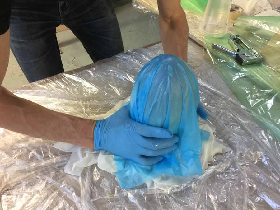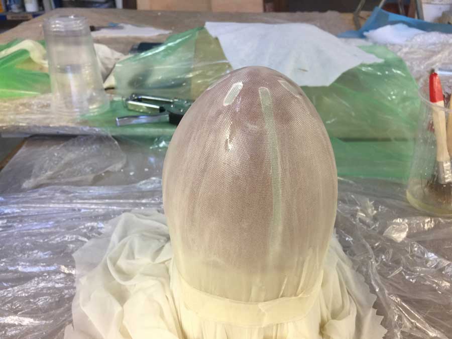 I layed a thin layer of plastic film on the mold to isolate it from contact with the epoxy. Then I applied 5 layers of white licra cloth spreading epoxy resin between each layer.