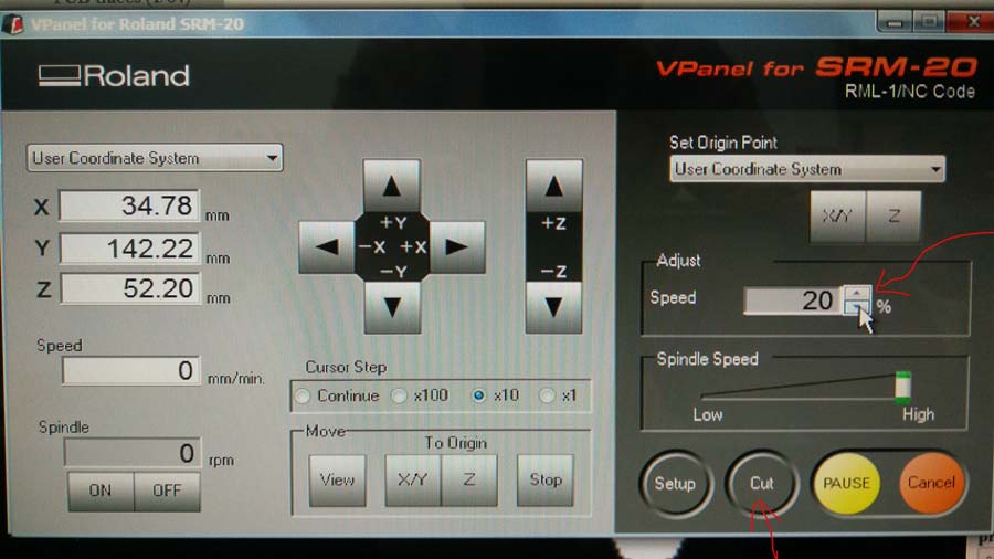 The spindle postion is moved by clicking the arrows in the SRM20 application window. There is a 4 arrows for X (left and right) and Y (backward and forward). I first set the XY by moving the spindle to the corner (front left) of the board leaving a little margin of 2 mm. approx. Than pressed the XY botton in the "set origin point" section of the appication.