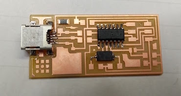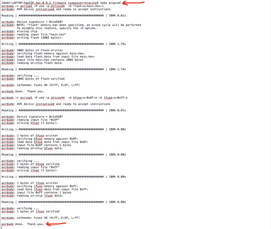 Now that I comfirmed the board mounts it need to be programmed. The programming consist of embedding the microcontroller with the capacity to become a programmer. For this to happen a program needs to be uploaded onto the FabISP using a programmer which can either be an AVRDUDE external programmer or another FabISP that has alkready been programmed. The advantage of the AVRdude is that it has a led signal that help identifying connection and troubleshoot. The programmer needs to be connected to the computer and its 6 pin connector to the 6 pin header of the FabIsp. Very important to make sure OF MATCHING THE POLARITY OF THE AVR PROGRAMMER NEGATIVE PIN WITH THE NEGATIVE PIN OF THE FABISP. OTHERWISE THAT CAN CREATE A SHORT CIRCUIT AND SCREW THE BOARD. When properly connected a green light will turn on the AVR programmer and the code can be loaded into the microcontroller).