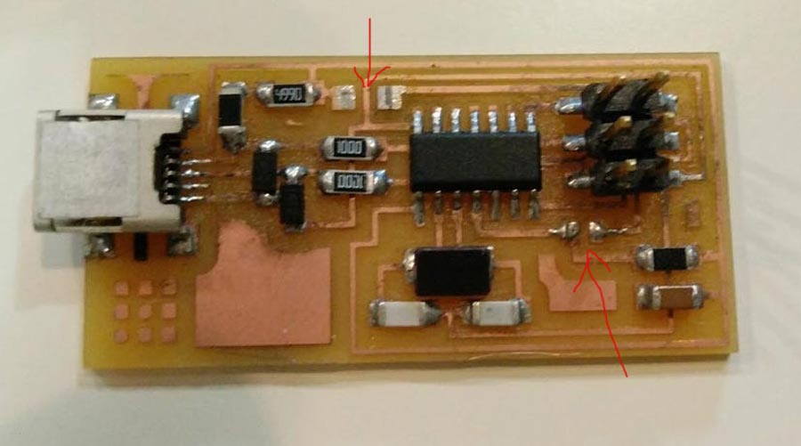 For the FabISP to be used as a programmer the 2 components we listed as "solder jumper" needs to be removed.