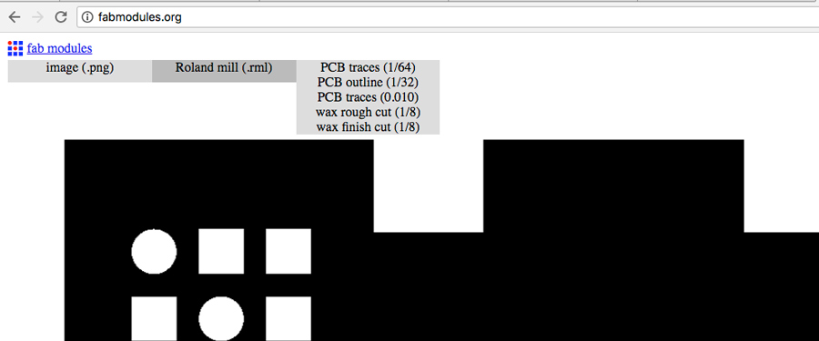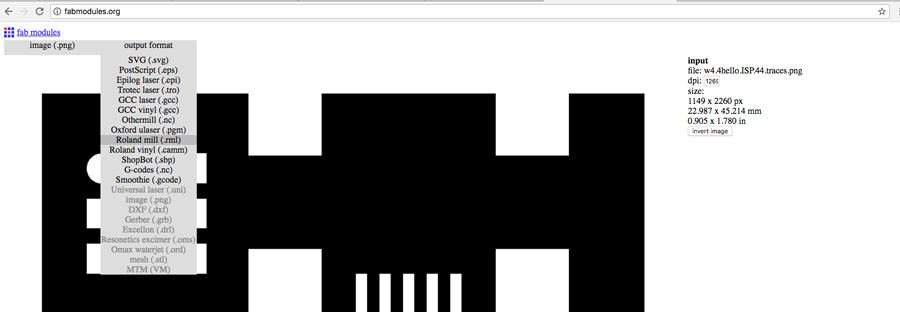 -select the file hello.ISP.44.traces.png from the desktop folder ( or anywhere it has been stored). The file uploads in the fab module window. The file opens in the fab module window. - select the Roland Mill (.rml) from the OUTPUT FORMAT tab.