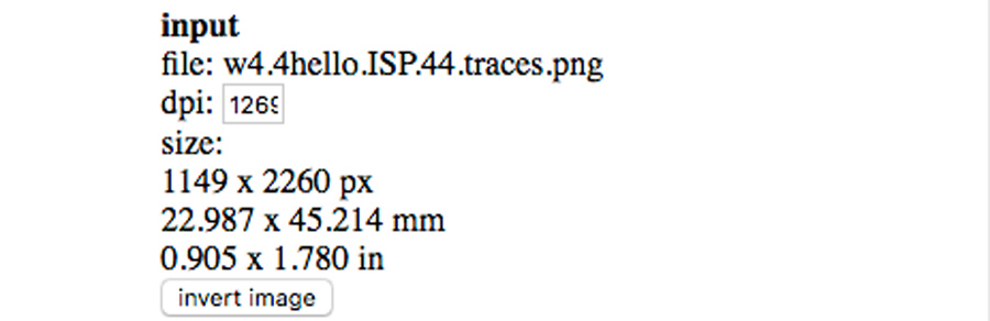 -In the intput section make shure the resolution (dpi) and image size matches the file you uploaded - a difference may have a scale effect making the board useless as the trace would not fit the component path. If it is the case go back to the export file and adjust it. The FabISP should be 22.987 x 45.214 mm in size.