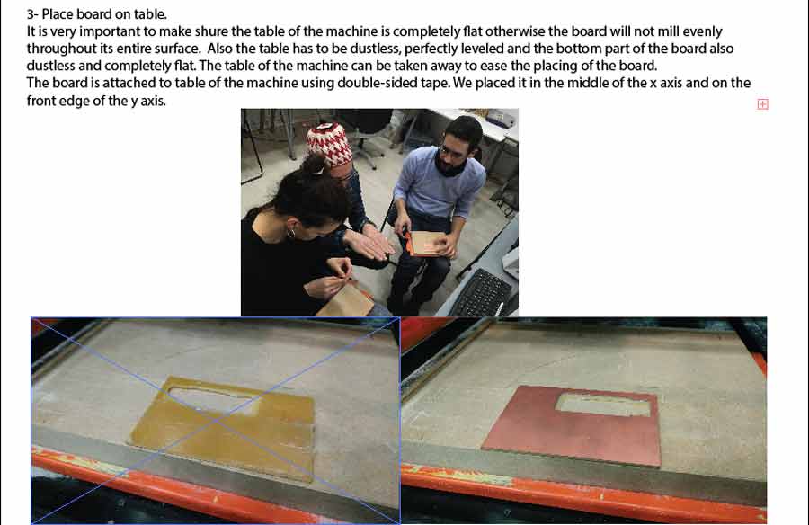 The board will be attached to the mill table using thin double-sided tape. The surfaces of both the machine table and the board ( the white side of the board - not the copper side) needs to be cleaned very well so there are no dust remaining on either surfaces and the tape should be applied equally throuhout the whole surface of the board making shure it lays completely flat and is well attached to the machine bed. It is common in labs with many people using the Modela that the bed is not perfectly calibrated. The previous user should have notice and warn the fab manager but it is often not the case.