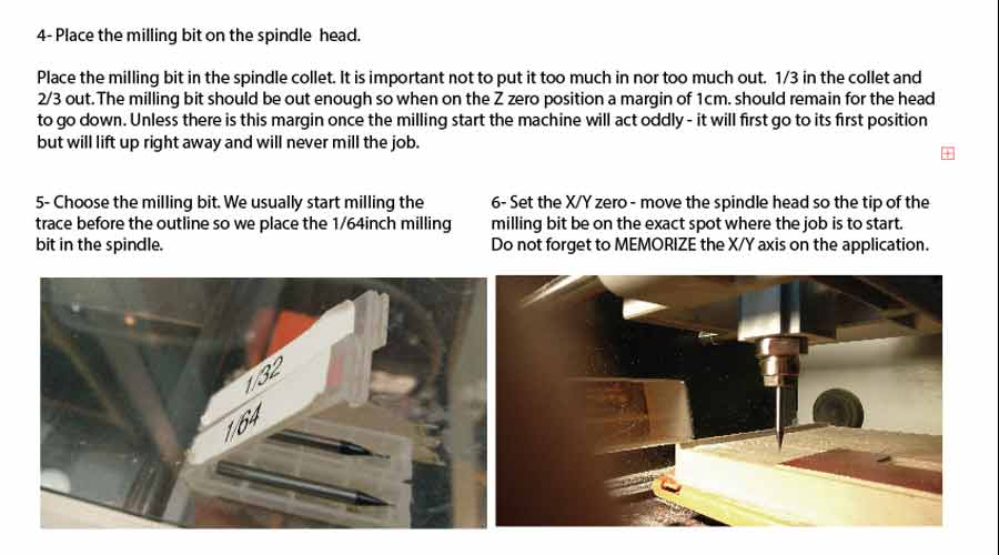 -Make shure the usb cable is connected to the computer and turn the machine on. The machine automatically bring the table to the view position making it easier to insert the milling bit on the spindle and the board to the machine table.