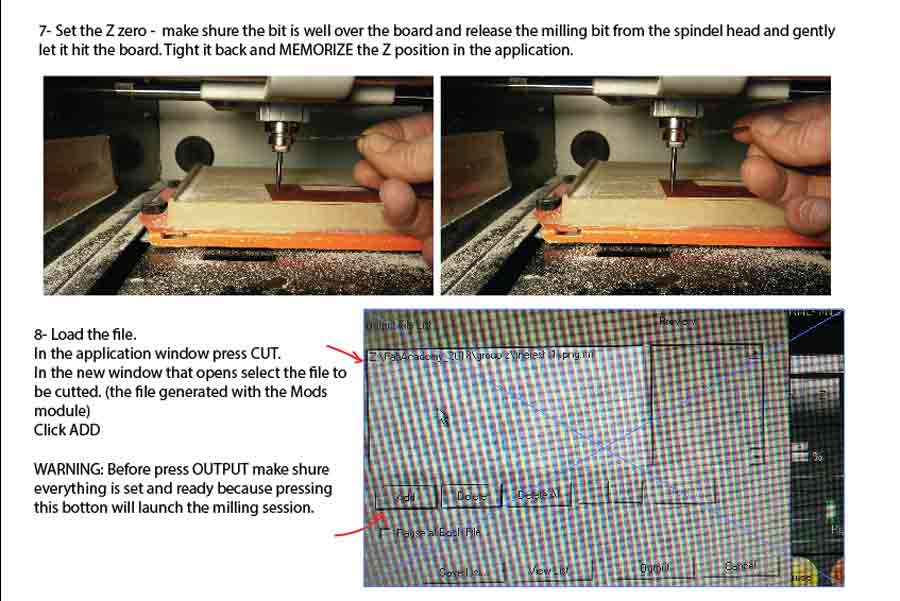 DO NOT FORGET to press the Z botton below the "set origin point" of the application window. Now the X,Y and Z are set and ready to mill the job. It is important to remember that the X and Y zeros should never be changed while milling one job.