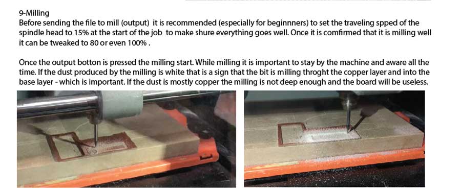 The dust created by the end mill should be whitish all through the path indicating it is milling through the copper layer. If not it means the board or the table is not flat and the board won't be usable. To remedy that the job can be resend after adjusting the Z axis a 1/1oth of mm. down. If so make shure the board has not been moved.