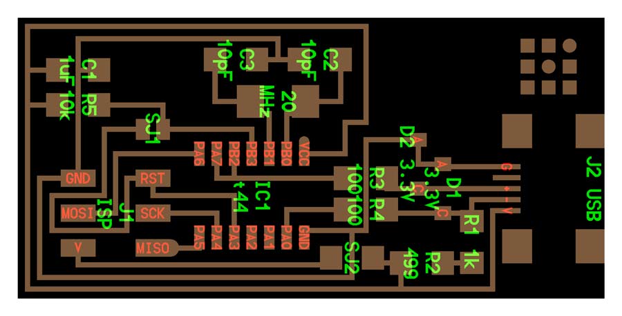 To proceed with the exercise I refered Electronic production tutorial on our lab page. I downloaded the 4 files provided in the link. The first one is an example of the finished board. The next one is the labeled board which serves as reference for tracing and to know which are the components and where they have to be placed on the board.