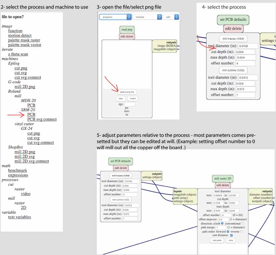 The files shown above needs to be prepared for the CNC mill to proceed. It is recommended to start milling the trace file first and the outline afterwars because if something goes wrong with milling the traces (which is THE important part) it will have to be redone and worthless having milled the outline. The TRACE file has to be milled with the 1/64 inch milling bit and the OUTLINE file has to be milled with the 1/32 inch milling bit.
