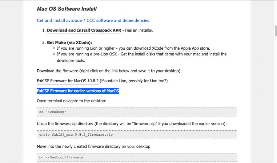 To program the FabISP from a MacOs Xcode and Croospack AVR need to be installed. (I already have them installed on my computer). It can be downloaded from the Apple developper and the Crosspack AVR that comes with the installer.