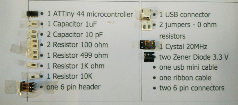 Stuffing the board consists of soldering the components onto the board in their right position and orientation. I selected each components and stuck them to a a sheet of paper where I have listed them. Components are small and can be easily mismatched.