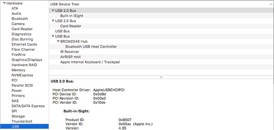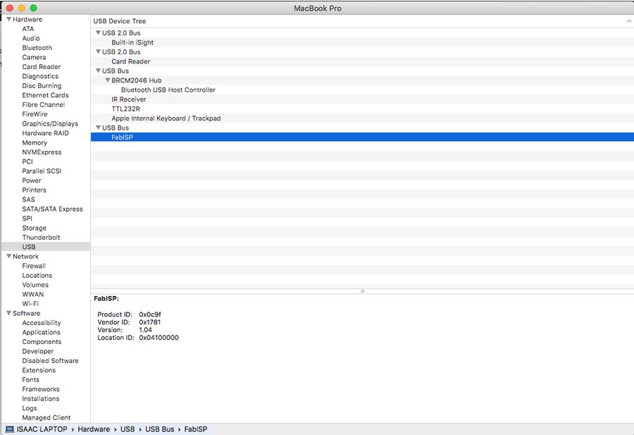 Once the stuffing was done I crossed my finger and connected the Fab Isp to the USB port of my computer and get a positive response. To verify the FabISP is connected and recognized by the system in MacOS go to : "about this mac" and open the system report window and click the USB device list. An "AVRISP" (until the board is programm it is not yet a programmer and shows listed as AVR ISP) shows in the list.