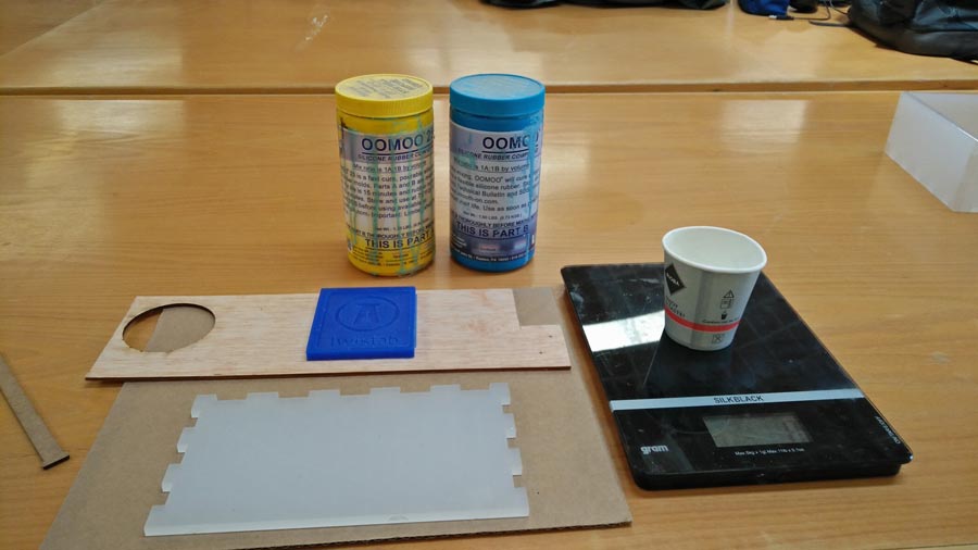 To cast the rubber stamp I use Smooth-on PMC790, a non-volatile liquid Polyurethane Elastomer containing a small proportion of toluene diisocyanate which is designated as hazardous. Handling requires safety glasses, long sleeves and rubber gloves to minimize contamination risk. Good ventilation is necessary. In non ventilated environment wear respiratory equipment.