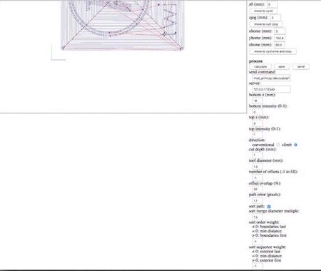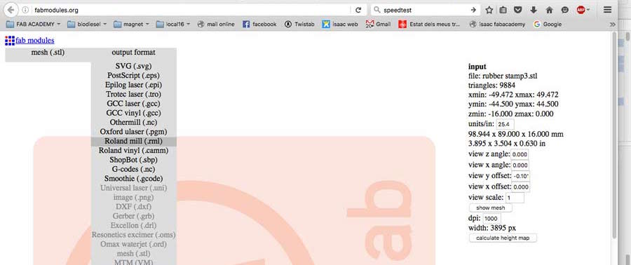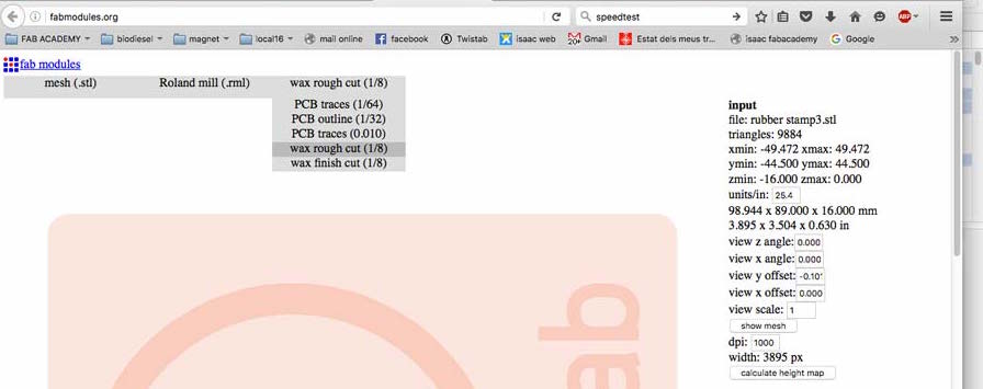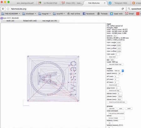 I exported the rhino file to .stl and imported it to the fabmodule. I made a first "rough cut" and after a "fine cut" both with the 1/8inch endmill.
