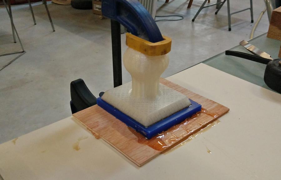 I applied the liquid with a brush on both surfaces, clamp them together and let it sit there for 12 hours. and The result was just perfect- the PLA and silicone rubber bounded strongly. I repeated the whole process for a second unit that I will be usiing to stamp the packaging of my products.