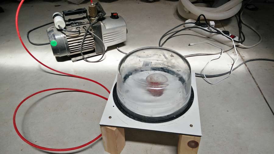 After mixing the 2 parts according to the reccomendations I purged the air with the vaccum chamber. I like this machine. It is quite amazing how many bubbles are stored into the liquid that apparently is transflucid.The matter is suddenly alive.