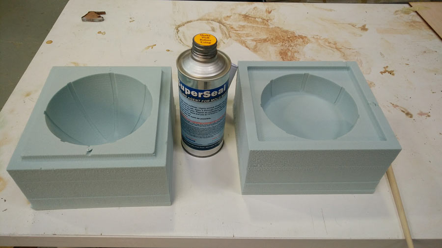 It would require a very small endmill to do that. No matter I retouched it manually with a file. (I am not even shure it will be necessary to have any groove in the final design). I made a big and a small hole at the bottom of the mould. The big one is to pour the concrete in the mould and the small one to evacuate the air. I sprayed the interior part of the mold to seal the porosity of the foam. Put 3 coats, letting it dry 15min. between each coats.