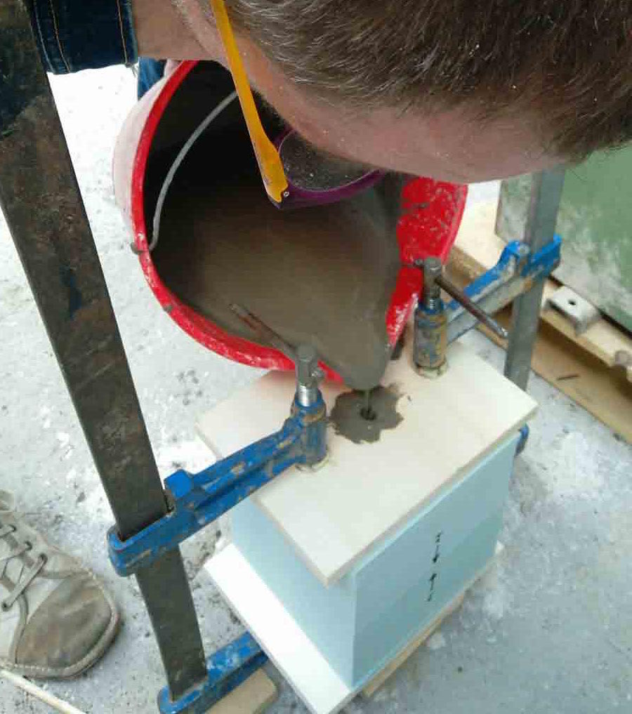 This cement is normally use to repair damaged cements structure and has a very fine grain which creates beautiful textures and finishes in moulded elements. Because I am not using the cement fo structural purpose and needs the mix to be more liquid so it pours easily in the mold I stretched the porportion of water to 2.5 liter75kg cement. I mixed the 2 components and stirred it thouroughly until it has a consistency that spreads easily inside the mold and the cement and the water remain binded. This material reacts pretty quicjkly so it is good to have the mould, tools and strategy ready for pouring before mixing.