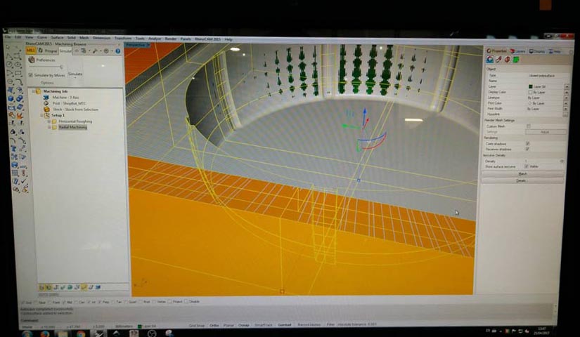 I created Cam files in RhinoCam using 3Axis machining and toolpath for a rough extraction (5 minutes.) and a fine milling with a 75% overlap of the mill path (35minutes).