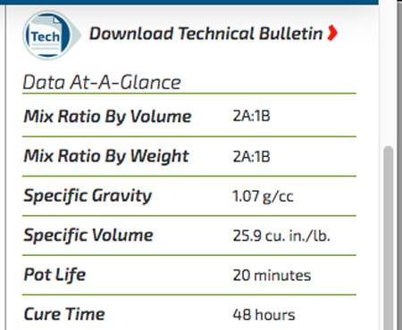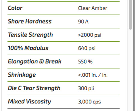 The material has a sharp pungent odor, is non-flamable and has a flash point of 132ºC. It is composed of PART A (clear yellow) + PART B (dark amber) to be mixed in 2A:1B proportion and a demoulding time of 48 hours. Product has limited shelf life which reduces drastically once containers have been opened. It is recommend to label containers with last date of use. And in case of doubt testing is necessary.