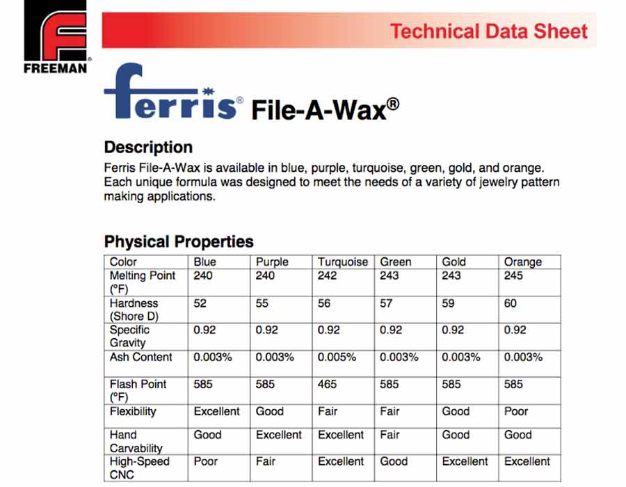 The material I am using is Ferris File-A_Wax blue made by Freeman Manufacturing and Supply Company. The product is blue solid wax insoluble that melts at 240º F. and hardens at 52ºF. Flash point, which is the temperature at which the wax catch fire, is 465ºF. This wax has a mild odor and is not considered an hazardous substance or mixture though breathing vapor, mist or gaz shall be avoided. When hot material should not have contact with skin. An appropriate exhaust ventilation environment should be provided when work on implies dust material. The use of a full face shield, safety glasses and gloves are compulsory when habdling heated material. For more detailed informations see the Safety data sheet.